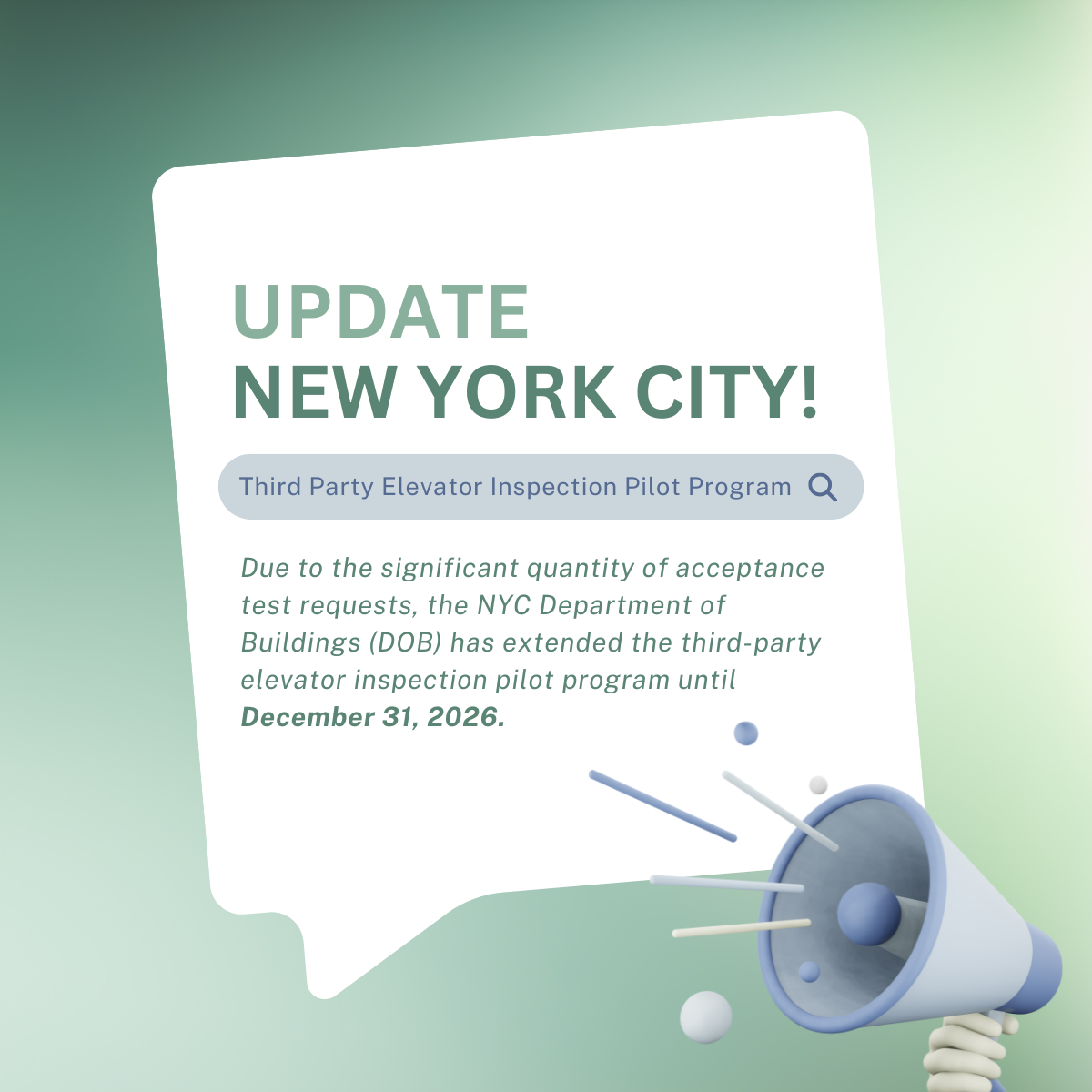 Due to the significant quantity of acceptance test requests, the NYC Department of Buildings (DOB) has approved a pilot program that started June 1, 2025, that allows licensed third-party agencies (such as BOCA Group) to witness, supervise, and ultimately sign off on these tests in place of the DOB. They are allowing this process to be done on modernizations, repairs, and new installations, and they have established guidelines and paperwork for all of this to happen. The DOB is extending this program to run until December 31, 2026. They reserve the right to end the program early, extend the program, or amend the requirements at any time.
